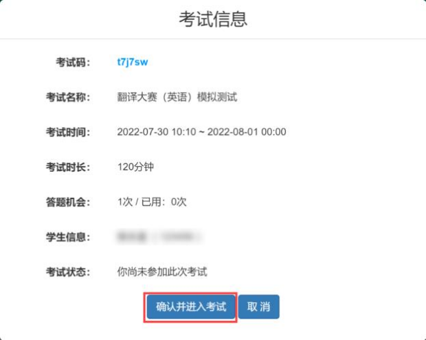 (四)确认考试信息:参赛选手仔细核实考试相关信息, 信息确认无误后,点击“确认并进入考试”按钮后进入考试。
