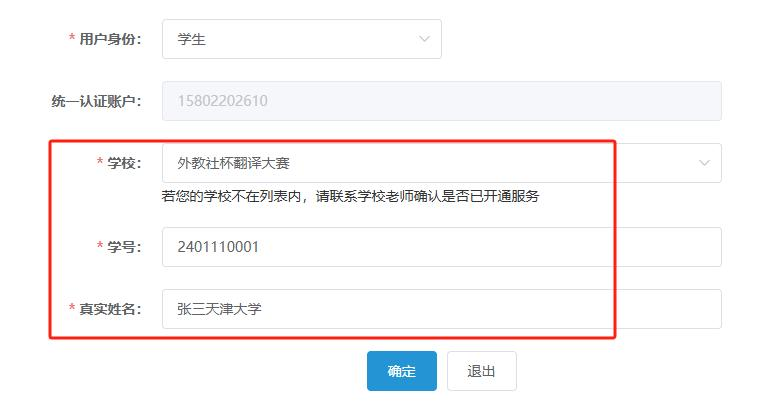 使用电脑登录 WE Test 网站,第一次登录时需要完善个人信息,务必正确填写学校和学号,注意:学校必须选择“外教社杯翻译大赛”。如填错,可登录网页在个人信息中修改并保存。