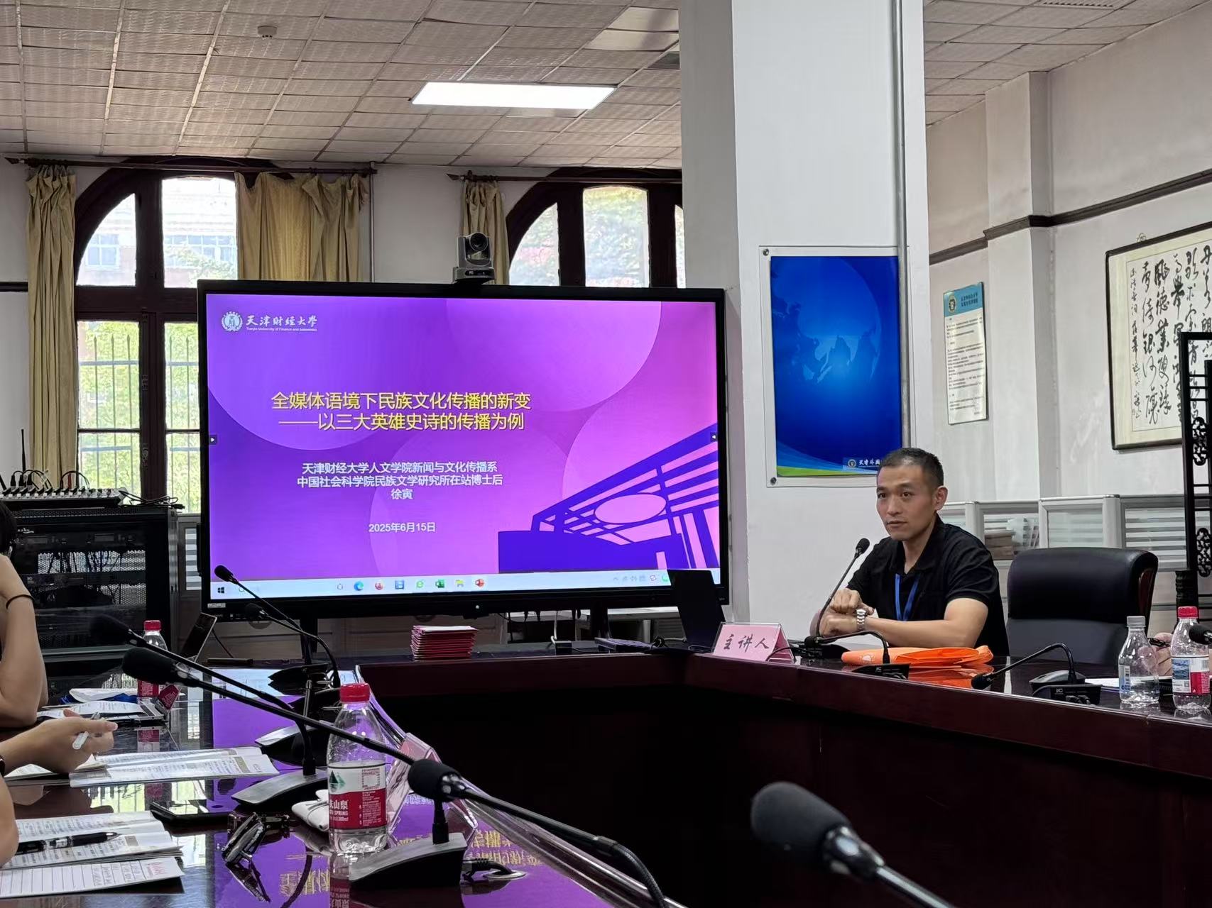 新闻与文化传播系徐寅老师参与了6月15日下午第三分会场的发言。徐寅老师做了全媒体语境下民族文化传播的新变的发言,他从传播媒介、传播内容、传播者及形式以及传播效果四方面对中国三大英雄史诗在媒体时代的传播进行了深入浅出分析,并借2024年春晚上的《永恒的诗篇》这一节目对三大英雄史诗同台展示所呈现出的特征进行了进一步剖析,最后,他还提出媒介形态的变化对于史诗这类古老文学形式的传承与传播产生了“双刃剑”的效果,需合理看待。徐寅老师汇报的论文获得本届学术研讨会一等奖。现场围绕徐老师的议题展开了激烈的讨论,有很多研究意见的分歧和理论建构的大胆探索,显示了史诗这一非遗形态的当代价值。