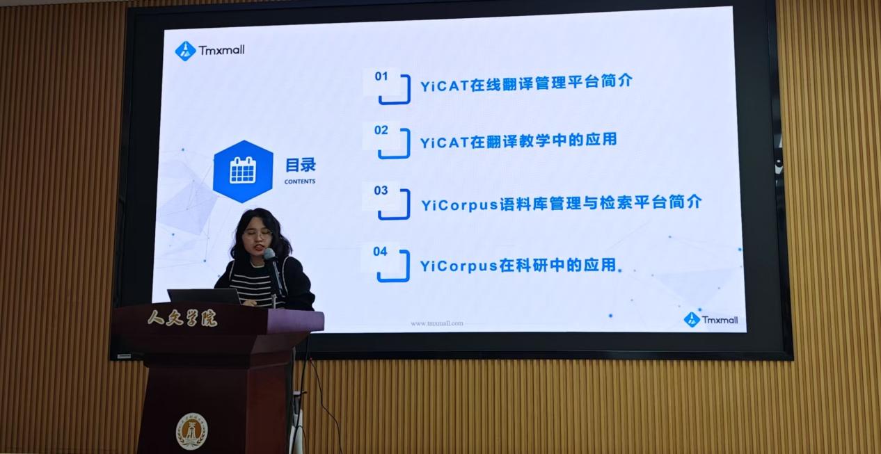 首场讲座以“YiCAT与YiCorpus在教学和科研中的应用”为主题,由上海一者信息科技有限公司项目经理彭颖娇女士主讲,讲座详细演示了YiCAT翻译管理平台的协作翻译、术语管理等功能如何助力课堂教学效率提升,并重点介绍了YiCorpus语料库工具在学术研究中的检索与分析应用。参会师生表示,此类工具能有效优化翻译课程设计、助力翻译实践,同时为科研论文撰写提供丰富的工具支持。