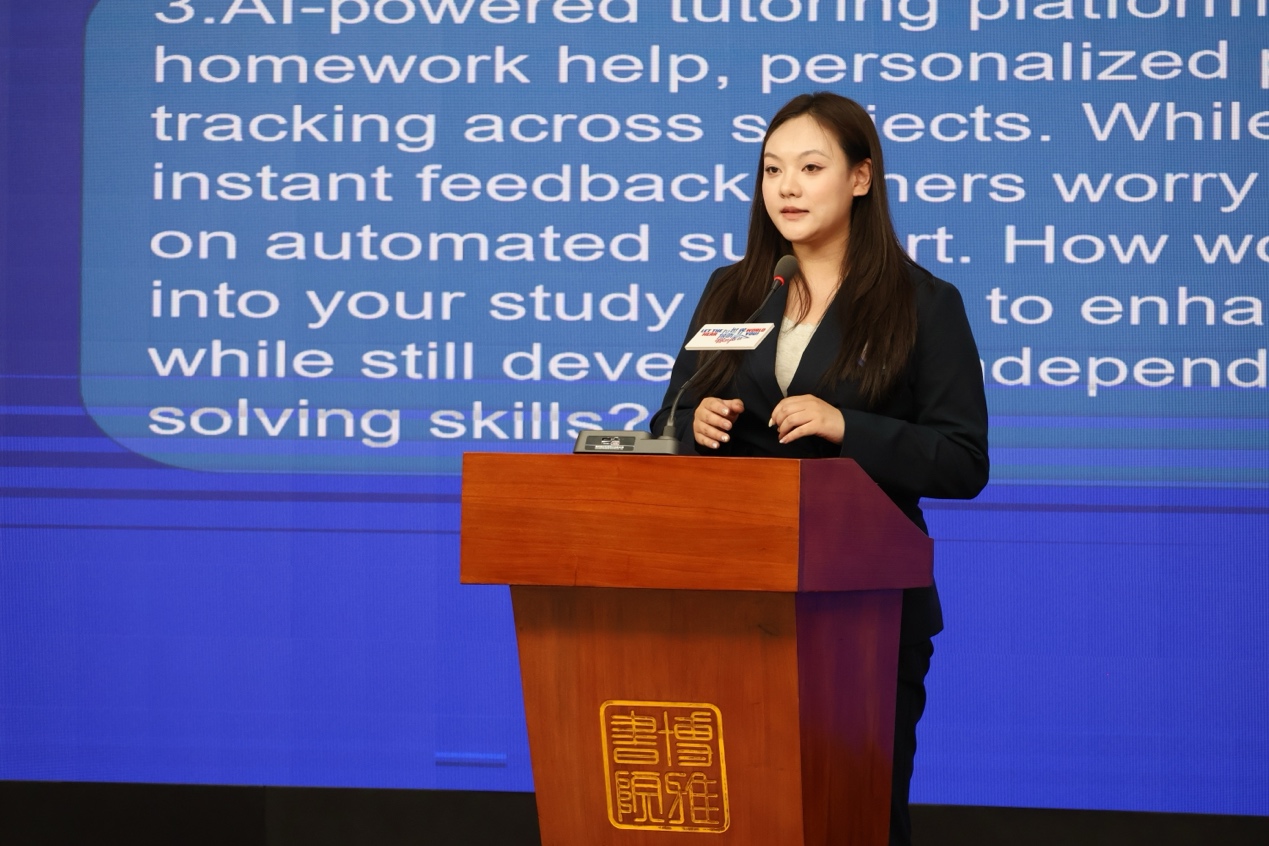 本次比赛以“Living within and beyond the 21st century”为主题,我校两位参赛选手从可持续发展、想象力激发创新和未来展望等角度进行了精彩演讲。杨德璠同学生动讲述了从祖辈“向自然索取”到当代“与自然共生”的观念转变,呼吁青年人勇于创新,用科技与智慧重塑人与自然的关系;邓金果同学则从以“想象力:通往未来的通行证”为题,用诗意的语言描绘了创新思维的力量,探讨了青年一代在全球治理中的责任与担当。他们用流利的英语、独到的见解和饱满的热情,充分展现了天财学子扎实的专业功底、开阔的国际视野和强烈的时代使命感。